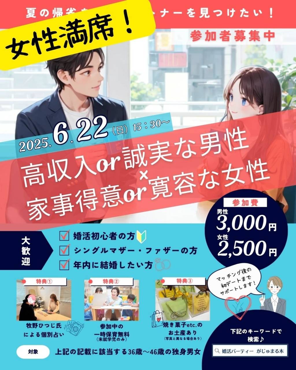 ◆女性満席!【がじゅまる木主催】6/22(日)15時半~『高収入or誠実な男性×家事得意or寛容な女性と出逢える婚活パーティー』/大阪府枚方市で出会いを探すなら保育園が運営する結婚相談所がじゅまる木』 経済的に安定している余裕のある男性or誠実な男性と出逢いたい方家庭的な女性or寛容な女性と出逢いたい方穏やかで幸せな家庭を築きたい方同年代の異性と出逢いたい方にピッタリな婚活イベントです!身元…