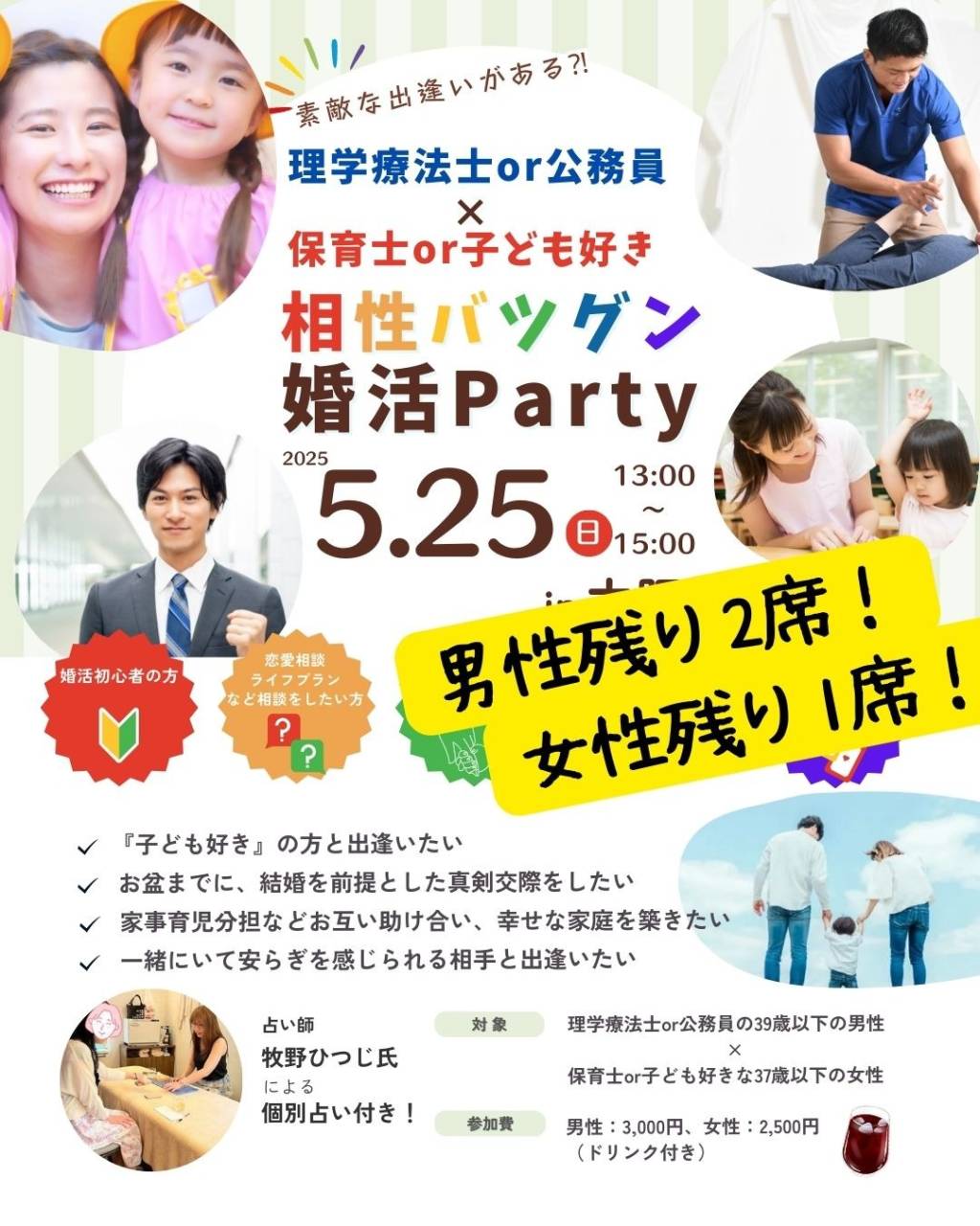 5/25(日)13時~『理学療法士or公務員×保育士or子ども好き♡相性抜群婚活パーティー』の集客状況をご報告♪ こんにちは。大阪府枚方市で婚活・妊活をサポートしている保育園が運営する結婚相談所がじゅまる木です!5/25(日)13時~開催予定の『理学療法士or公務員×保育士or子ども好き相性抜群婚活パーティー』の…