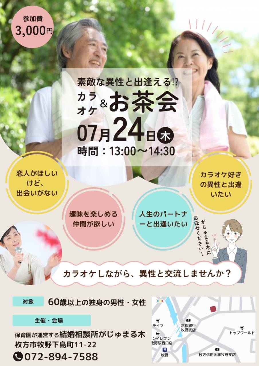 【がじゅまる木主催】7/24(木)13時~『60歳以上対象!異性と出逢えるカラオケ&お茶会』 お問い合わせ・お申込みは下記のお電話番号まで072-894-7588男性 60歳以上で1人で階段を登れる方女性 60歳以上で1人で階段を登れる方 お一人3,000円(ドリンク・お茶菓子付き)〒573-1142大阪府枚方市牧…