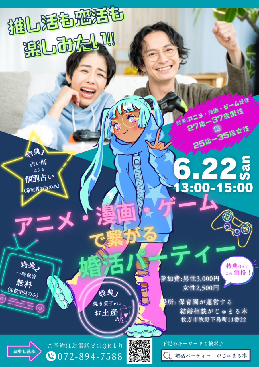 ◆男性満席!【がじゅまる木主催】6/22(日)13時~『推し活も恋活も楽しみたい!アニメ・漫画・ゲームで繋がる婚活パーティー』/大阪府枚方市で出会いを探すなら保育園が運営する結婚相談所がじゅまる木