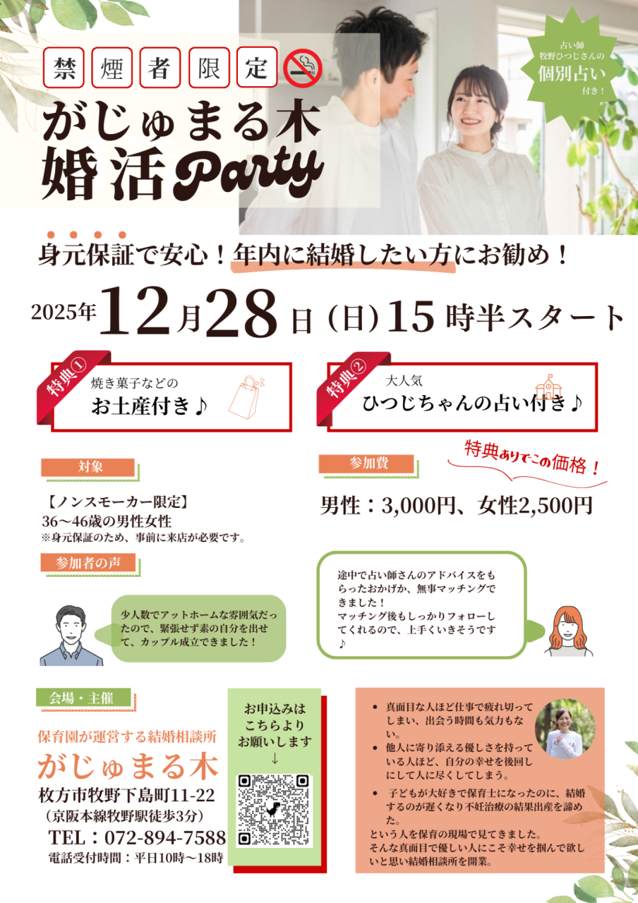 【がじゅまる木主催】12/28(日)15時半~『ノンスモーカー限定!アラフォー婚活パーティー』/大阪府枚方市で出会いを探すなら保育園が運営する結婚相談所がじゅまる木