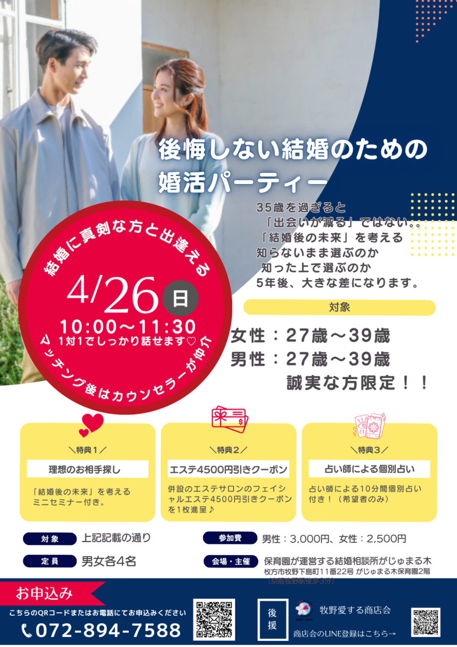 【がじゅまる木主催】4/26(日)10時~『後悔しないための婚活パーティー』/大阪府枚方市で出会いを探すなら保育園が運営する結婚相談所がじゅまる木